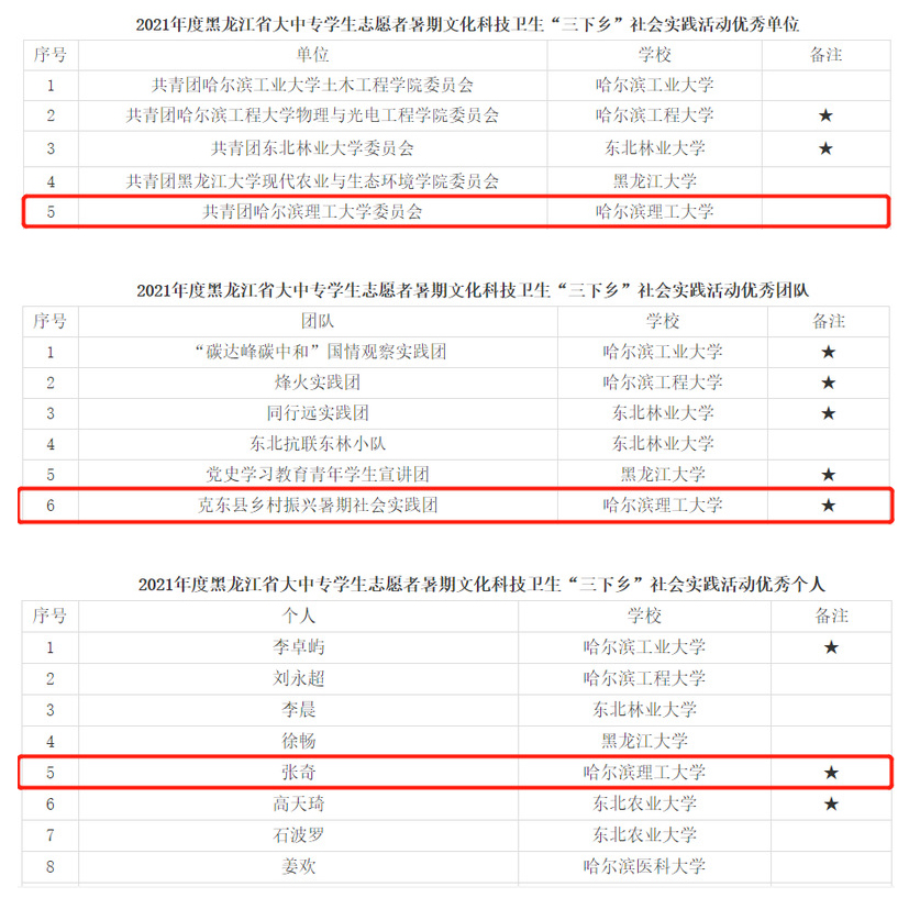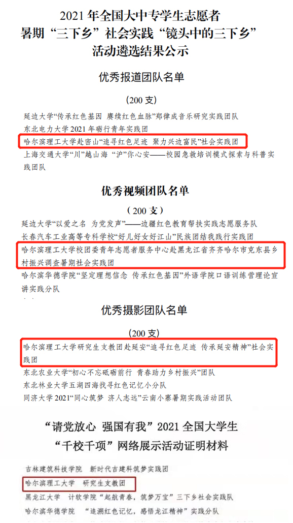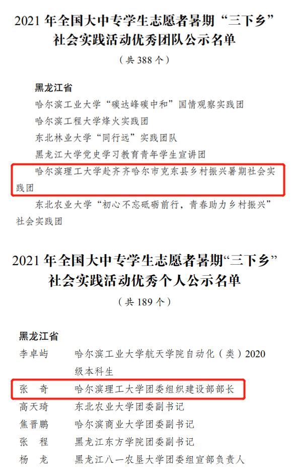 在团中央2021年全国大中专学生志愿者暑期“三下乡”社会实践活动总结表彰中,校团委学生志愿服务中心赴齐齐哈尔市克东县乡村振兴暑期社会实践团被评为“优秀团队”(全国共388个团队获此荣誉称号);校团委张奇同志被评为“优秀个人”(全国共189人获此荣誉称号)。国家级专项社会实践活动表彰中,我校1支实践团队荣获全国“千校千项”成果遴选“优秀团队”称号,3支实践团队在全国“镜头中的三下乡”实践活动成果展示中分别荣获“优秀报道团队”、“优秀摄影团队”和“优秀视频团队”称号。在团省委2021年度黑龙江省大中专学生志愿者暑期文化科技卫生“三下乡”社会实践活动表彰中,校团委被评为“优秀单位”;校团委学生志愿服务中心赴齐齐哈尔市克东县乡村振兴暑期社会实践团被评为“优秀团队”;校团委张奇同志被评为“优秀个人”。