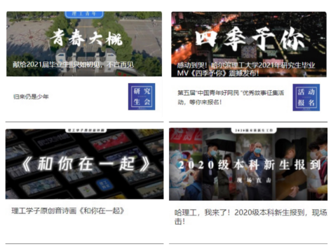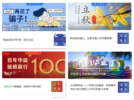 构建“互联网+共青团”工作格局。结合青年喜闻乐见的方式,探索符合青年特点的宣传话语体系,发挥校园新媒体矩阵多维覆盖作用,培育积极健康、向上向善的网络文化,打造“有态度、有温度、有影响”的哈尔滨理工大学网上共青团组织。围绕中国共产党成立100周年、“五四运动”100周年、新中国成立70周年等主题推出系列专题活动。以官方微信公众号“理工青年”为平台,推出《遇见理工,遇见美好》等优质文章。“理工青年”公众号累计发文2237篇,最高阅读量达7.1万人次,总用户数超5.7万。“理工青年”公众号多次在全国高校团委微信公众号综合影响力排行榜上位列前茅。