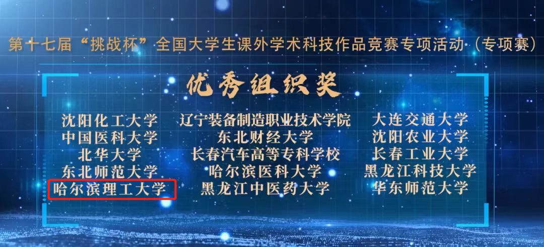 五彩“挑战杯”,多彩创新梦!近期,由共青团中央、中国科协、教育部、中国社会科学院、全国学联、四川省政府共同主办,四川大学承办的第十七届“挑战杯”全国大学生课外学术科技作品竞赛闭幕式暨“科创先行,强国有我”网络主题活动举办。哈尔滨理工大学荣获第十七届“挑战杯”全国大学生课外学术科技作品竞赛专项赛优秀组织奖,黑龙江省共4所高校获此殊荣,校团委张奇同志荣获优秀组织个人。本届竞赛全国累计有2500多所高校的2.2万件作品参赛,参赛高校和辐射学生数均创历史新高。经过激烈角逐,我校在主体赛中获得三等奖2项,红色专项赛中获得二等奖2项,创造了我校自参加“挑战杯”赛事以来的最好成绩,实现了历史性突破。