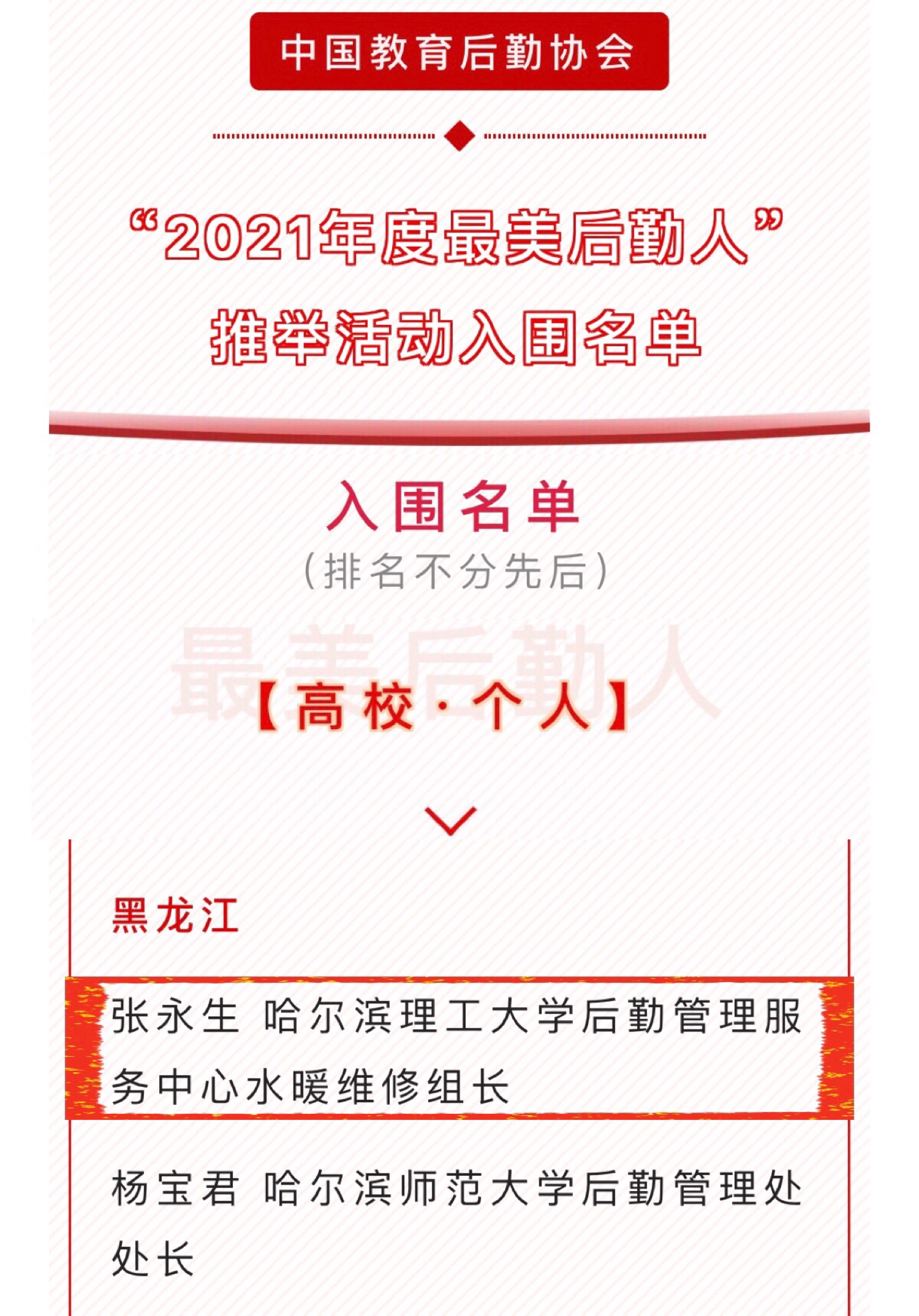 4月19日,中国教育后勤协会发布《“2021年度最美后勤人”推举活动入围名单公告》,我校后勤管理服务中心水暖维修组长张永生成功入围。黑龙江省高校领域仅有两人入围。