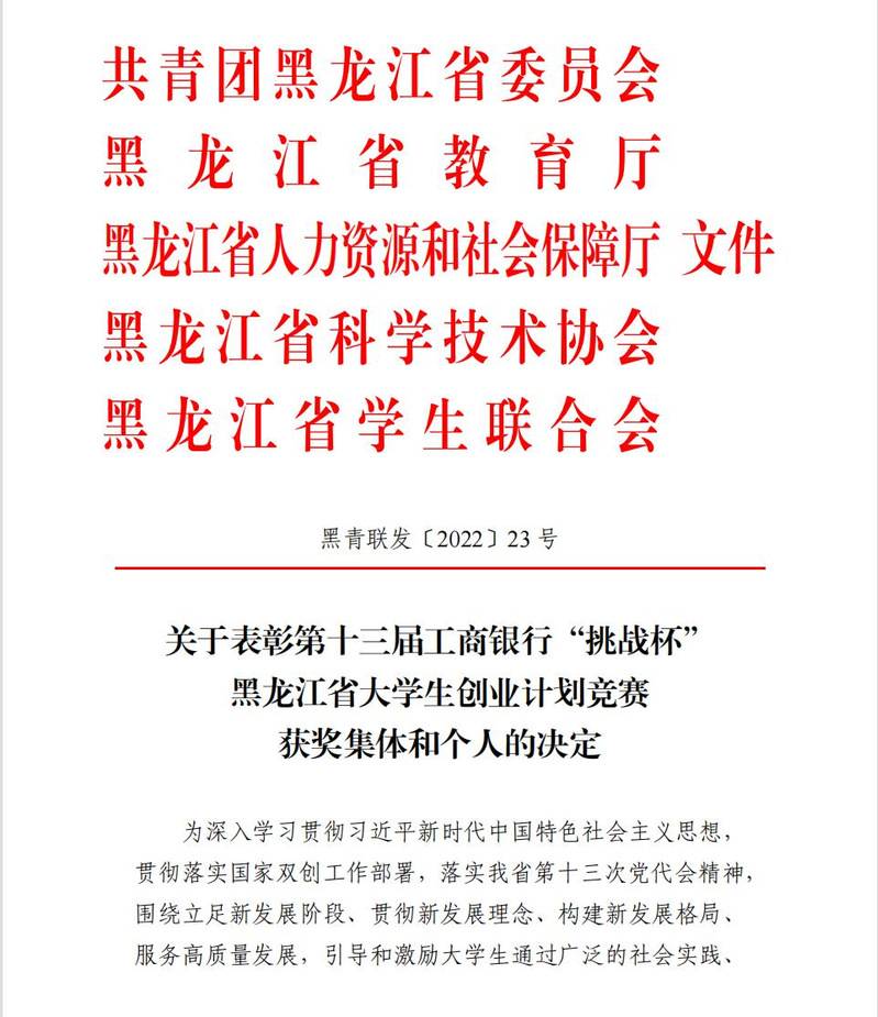 本届“挑战杯”黑龙江省大学生创业计划竞赛聚焦“创新、协调、绿色、开放、共享”五大发展理念,深入贯彻落实黑龙江省第十三次党代会精神,设有科技创新和未来产业、乡村振兴和农业农村现代化、城市治理与公共服务、生态环保和可持续发展、文化创意和区域合作五大赛道,涵盖数字经济、生物经济、高端设备等类别的大学生创业项目,吸引了74所高校的9400个项目报名参赛,经过校级选拔和省级复赛选拔,最终有50所高校的550余个项目进入省级决赛。省级决赛通过“线上+线下”相结合的方式进行,比赛设置“直播路演”“线上答辩”等环节。我校自2022年3月启动本届“挑战杯”竞赛项目孵化暨校赛选拔工作,该项赛事得到学校领导和各级部门的高度重视与支持,校团委、教务处与各学院联勤联动,全校师生积极参与项目选拔推荐;校团委发挥团组织服务力、保障力,通过实践调研、专题培训、专家辅导、备赛集训、答辩路演等方式,提升了我校参赛作品的质量。参赛全体学生纷纷表示,在本次竞赛中,不仅提高了自己科技创新能力,增长了自己的见识,还培养了自己吃苦耐劳、勇于创新与挑战自我的精神,希望未来能在祖国创新创业发展中做出自己贡献。