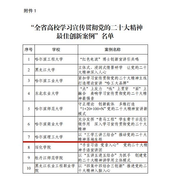 本次学习宣传贯彻党的二十大精神创新案例评选,是由省委教育工委组织开展,经高校党委推荐、组织专家评审,评选产生了“全省高校学习宣传贯彻党的二十大精神最佳创新案例”10个、“全省高校学习宣传贯彻党的二十大精神优秀创新案例”30个。自党的二十大胜利召开以来,学校党委高度重视党的二十大精神学习宣传贯彻,着力推动“第一时间”跟进学、“示范带动”规范学、“融入课堂”深入学;着力开展高位推动覆盖讲、上下贯通融合讲、先优典型特色讲;着力与提能力、转作风相结合、与推行“马上就办”相结合、与“引育留用”一体推进的人才工作格局相结合,助力龙江全面振兴全方位振兴,展示了我校在深入推动党的二十大精神入脑入心、落地生根的生动实践、亮点工作和典型经验,为深入学习贯彻党的二十大精神提供了积极借鉴。