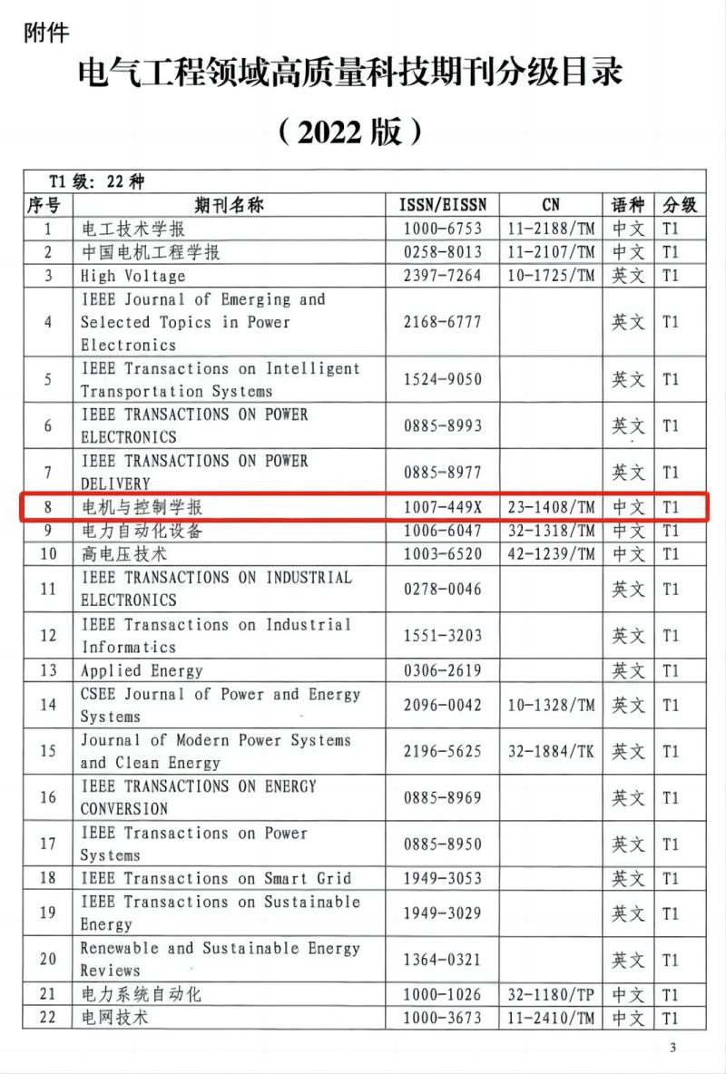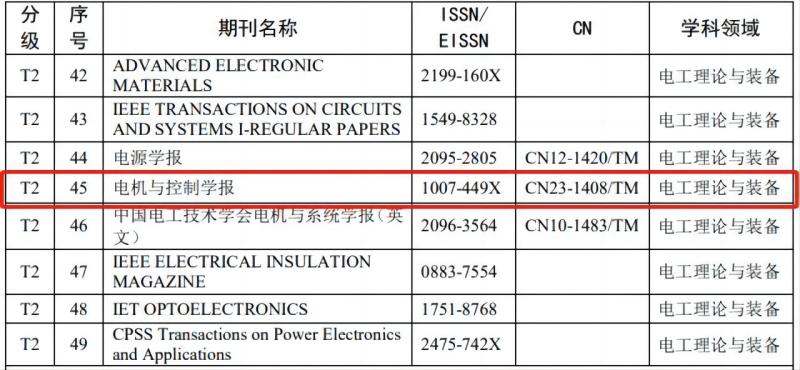 中国电机工程学会从868种覆盖学科领域的期刊中遴选出139种期刊列入《能源电力领域高质量科技期刊分级目录(2022年版)》,包括T1 级期刊27种,T2级期刊49种,T3级期刊63种,《电机与控制学报》位列T2级。