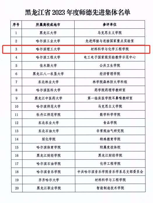 为弘扬尊师重教的社会风尚和广大教师立德树人、无私奉献的精神,省教育厅组织开展了2023年全省师德先进集体和师德先进个人评选活动。本年度共评选出师德先进集体66个、师德先进个人178人。我校材料科学与化学工程学院被授予“2023年度全省师德先进集体”荣誉称号,机械动力工程学院岳彩旭教授被授予“2023年度全省师德先进个人”荣誉称号。