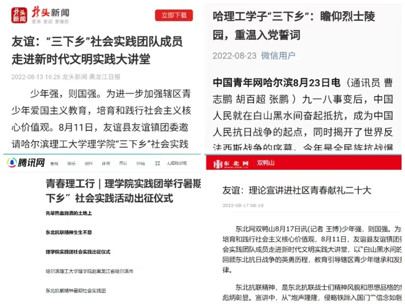 为了让更多的学生在社会大课堂中得到教育和成长,助力青年学生担当使命,2022年理学院团委立足思政课堂、用足实践课堂、做足创新课堂、深入开展党史学习教育,扎实推进暑期三下乡社会实践活动。组建“指导教师+榜样示范学生引领+普通学生广泛参与”三级联动组织,以研究生带领本科生,以高年级带领低年级,以党员带领团员群众,以点带面的开展“三下乡”社会实践活动;以中国共产党人精神谱系为指引,选定了具有区域特色的东北抗联精神,利用这些红色文化资源积极开展爱党、爱国教育。