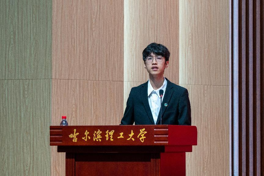 获奖学生代表、测通学院郑翔在仪式上发言。他表示一定珍视这份荣誉,绝不辜负学校的培养和学长们的期望,更加刻苦学习,取得更大的进步。作为新时代的哈理工人,将传承“大珩精神”,踏实前行,不负韶光,奋进当先,努力成为为母校争光的“理工娃”,接过学长学姐光荣的火炬,不断进取成为学校的骄傲,成为中国特色社会主义事业合格建设者和可靠接班人,成为堪当民族复兴大任的时代先锋。