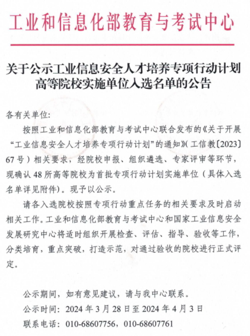 近日,我校成功入选工信部“工业信息安全人才培养专项行动计划高等院校实施单位”和“电子信息产业重点领域人才培养专项行动计划实施单位”,这是我校继2024年3月我校入选工信部“特色化网络安全产教融合创新中心”后,再次获批工信部两项人才培养专项行动计划。