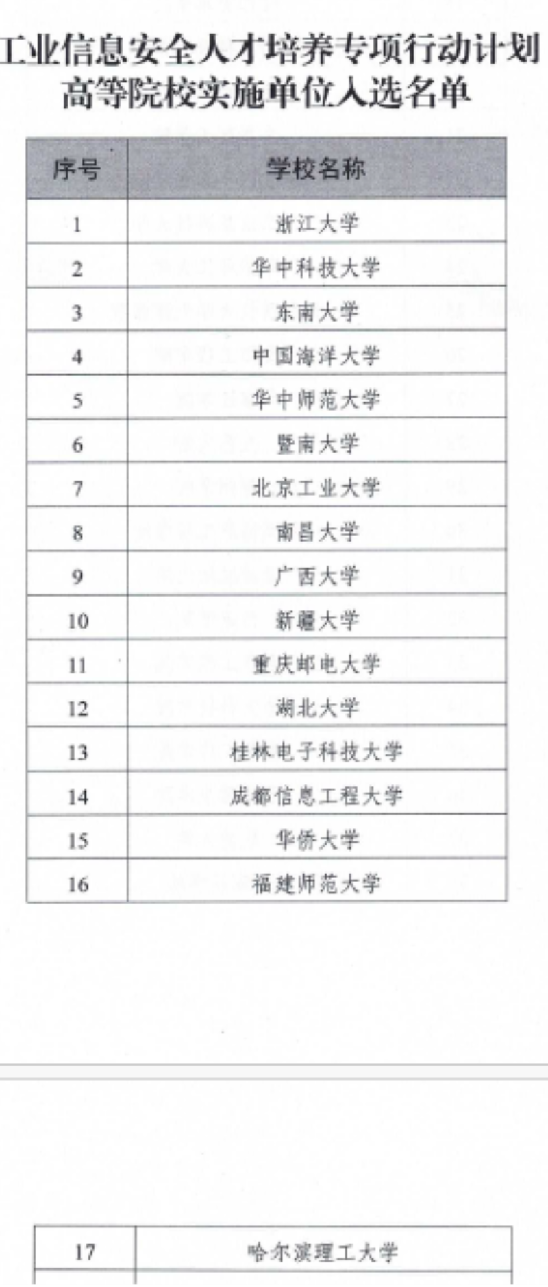 工业信息安全人才培养专项行动计划首批实施单位