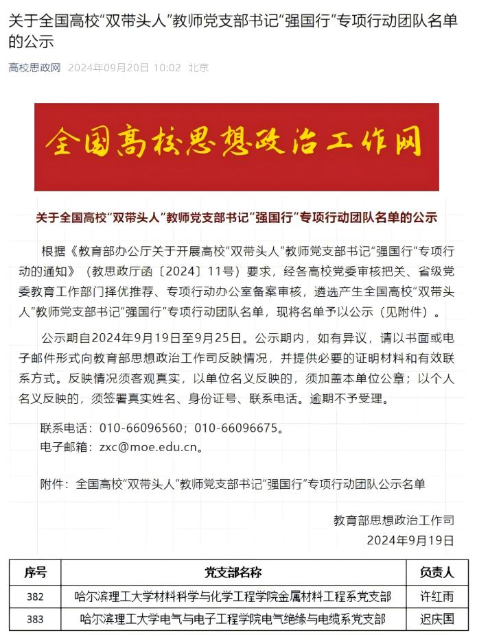 近日,教育部办公厅公布《关于全国高校“双带头人”教师党支部书记“强国行”专项行动团队名单的公示》,我校材料科学与化学工程学院金属材料工程系党支部、电气与电子工程学院电气绝缘与电缆系党支部成功入选。