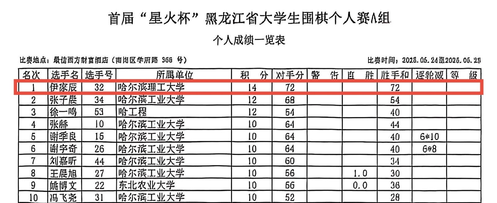 首届“星火杯”黑龙江省大学生围棋个人赛A组个人成绩