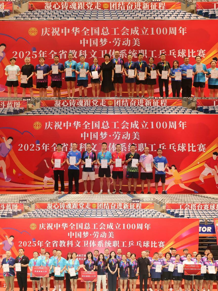 6月25日至6月27日,由省总工会主办、省教科文卫体工会承办的庆祝中华全国总工会成立100周年“中国梦·劳动美”2025 年省教科文卫体系统职工乒乓球比赛在哈尔滨会展中心成功举办。此次比赛是为深入学习贯彻习近平总书记在庆祝中华全国总工会成立100周年暨全国劳动模范和先进工作者表彰大会上的重要讲话精神,落实《健康龙江行动(2019—2030年)实施方案》要求,推动全民健身运动的开展而举办。来自全省教科文卫体系统12个厅局单位和地市教科文卫体工会,35个高校共计47支队伍500 余名职工同台竞技。