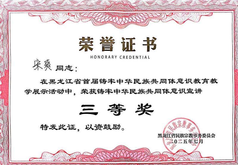 7月2日,黑龙江省首届铸牢中华民族共同体意识教育教学展示活动结果揭晓。我校推选的宣讲作品《中华民族共同体意识的千年传承与当代实践》,经过视频展示和现场教学两个环节比拼,荣获三等奖。