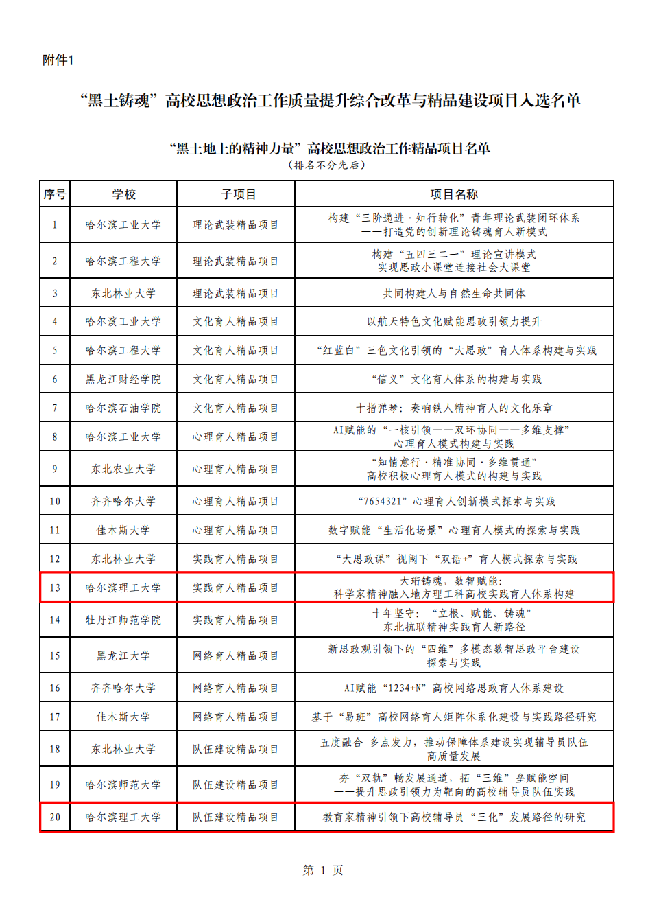 近日,黑龙江省教育厅公布2025年度“黑土铸魂”高校思想政治工作质量提升综合改革与精品建设项目入选名单,我校5个项目成功入选,入选项目数量居省内高校前列。