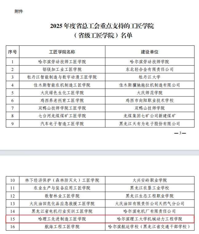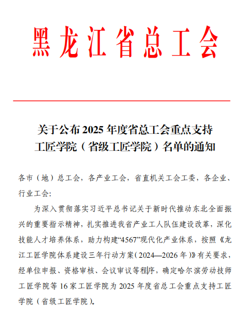 为深入贯彻党的二十大精神,落实习近平总书记在新时代推动东北全面振兴座谈会上的重要讲话精神,扎实推进我省产业工人队伍建设改革,深化技能人才培养体系,助力构建“4567”现代化产业体系,学校工会按照省总工会《龙江工匠学院体系建设三年行动方案(2024-2026年)》要求,积极培育指导相关学院开展工匠学院建设并喜结硕果。近日,我校机械动力工程学院申报的“先进制造工匠学院”成功入选黑龙江省总工会重点支持的工匠学院;自动化学院申报的“智能控制工匠学院”成功入选黑龙江省教科文卫体系统重点支持的工匠学院。