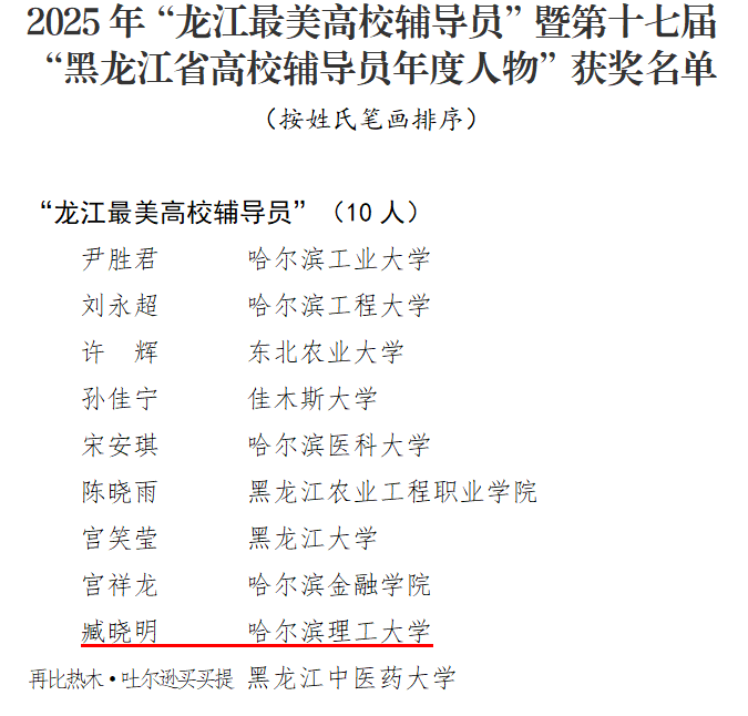 近日,黑龙江省教育厅举办2025年“龙江最美高校辅导员”暨第十七届“黑龙江省高校辅导员年度人物”推选展示活动,本次评选经学校推荐、资格审核、通讯评审、述职答辩等环节,推选出2025年“龙江最美高校辅导员”10人,“黑龙江省高校辅导员年度人物”10人,“黑龙江省高校辅导员年度人物提名”20人。我校经济与管理学院辅导员臧晓明荣获2025年“龙江最美高校辅导员”荣誉称号。