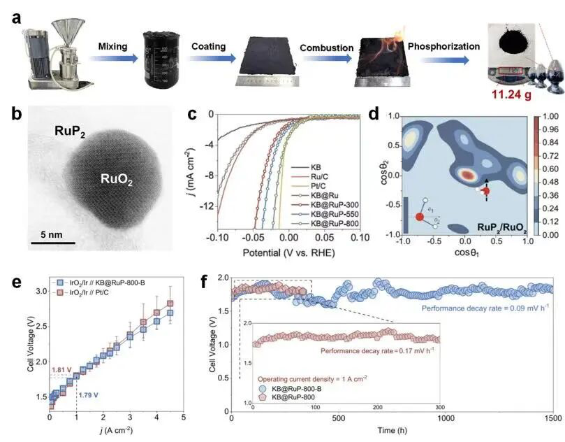 图为催化剂的(a) 制备路线,(b)球差电镜图,(c)电化学性能测试,(d)界面水分子取向分布,(e)在100 cm2级PEM电解槽中的极化曲线及(f)稳定性测试。